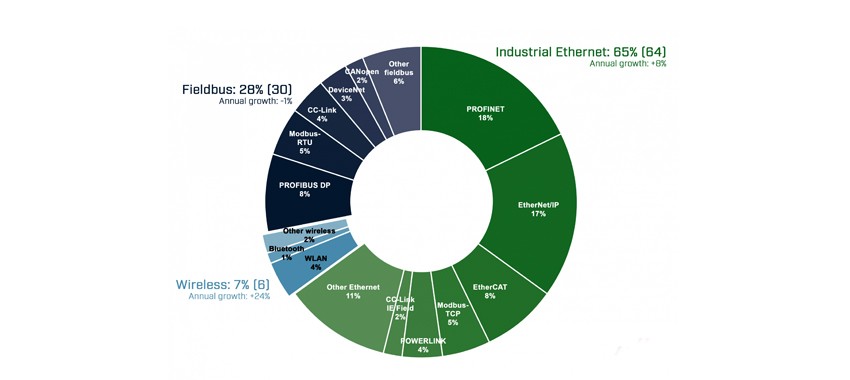 Yüzde 8 oranında büyüyen Endüstriyel Ethernet pazar payı kazanmaya devam ediyor. Endüstriyel Ethernet, hâlihazırda fabrika otomasyonuna yeni yüklenmiş olan düğümlerin küresel pazarda yüzde 65’lik bir kısmını oluşturuyor (geçen sene yüzde 64 olan bu rakama kıyasla). EtherNet/IP ve Profinet birincilik için yarışıyor olsalar da, Profinet yüzde 18’lik payı ile, bu yıl için tüm sıralamalarda yüzde 17’lik paya sahip EtherNet/IP’yi geçmiş bulunuyor. EtherCAT ise, küresel olarak iyi bir seyir izlemeye devam ederken, yüzde 8’lik pazar payı ile lider Profibus’ı yakalamış oldu. Modbus TCP yüzde 5’lik oranla onları takip ederken, fieldbus kardeşi Modbus RTU ile birlikte Modbus teknolojileri pazarın yüzde 10’unu elde etmiş durumda. Bu da, onların küresel olarak fabrika kurulumlarında sahip olduğu artan önemlerini teyit etmiş oluyor.